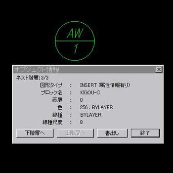 表示される情報は、図形タイプ・ブロック名・画層・色・線種・線種尺度・外部参照パス名・文字スタイル・寸法スタイル